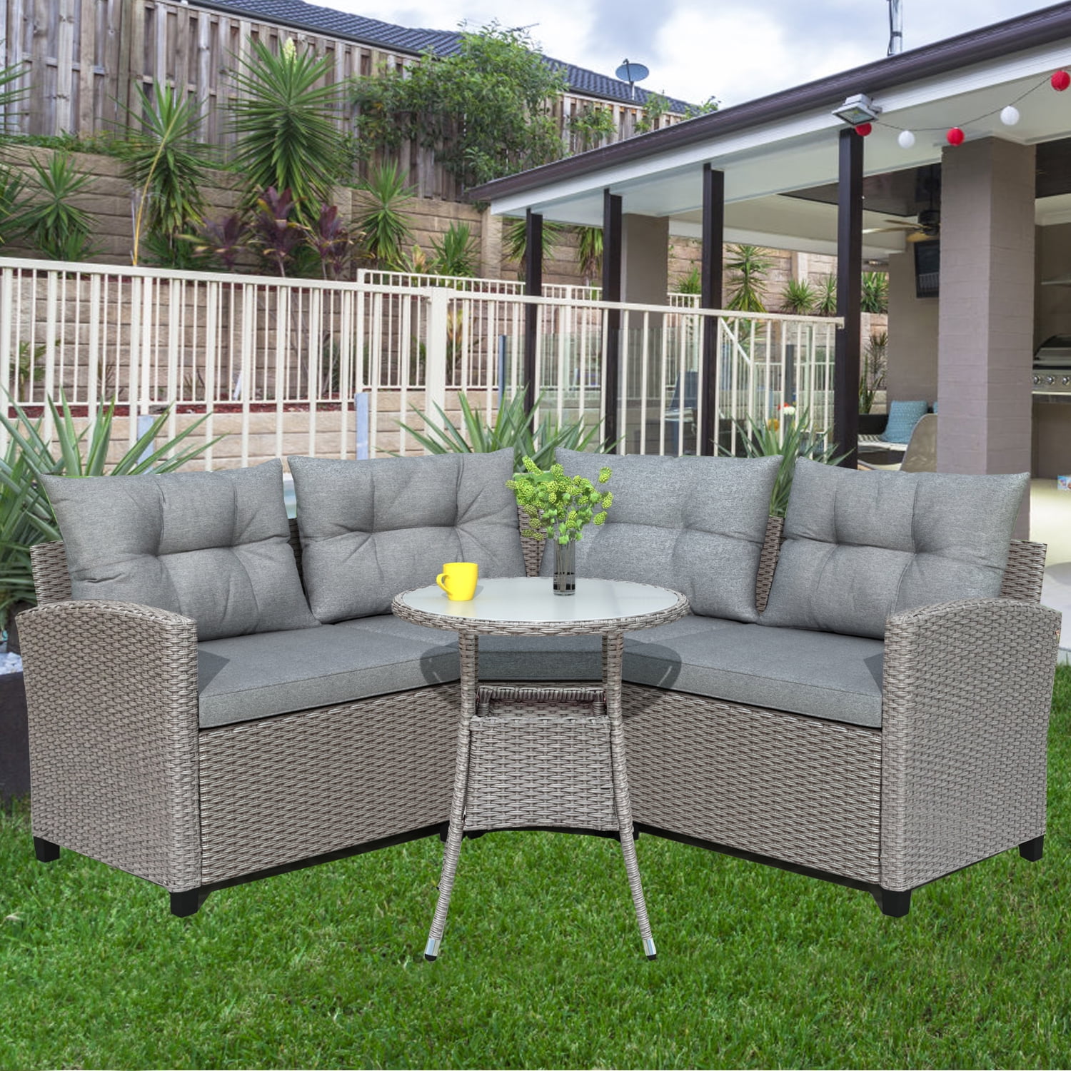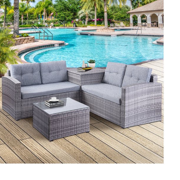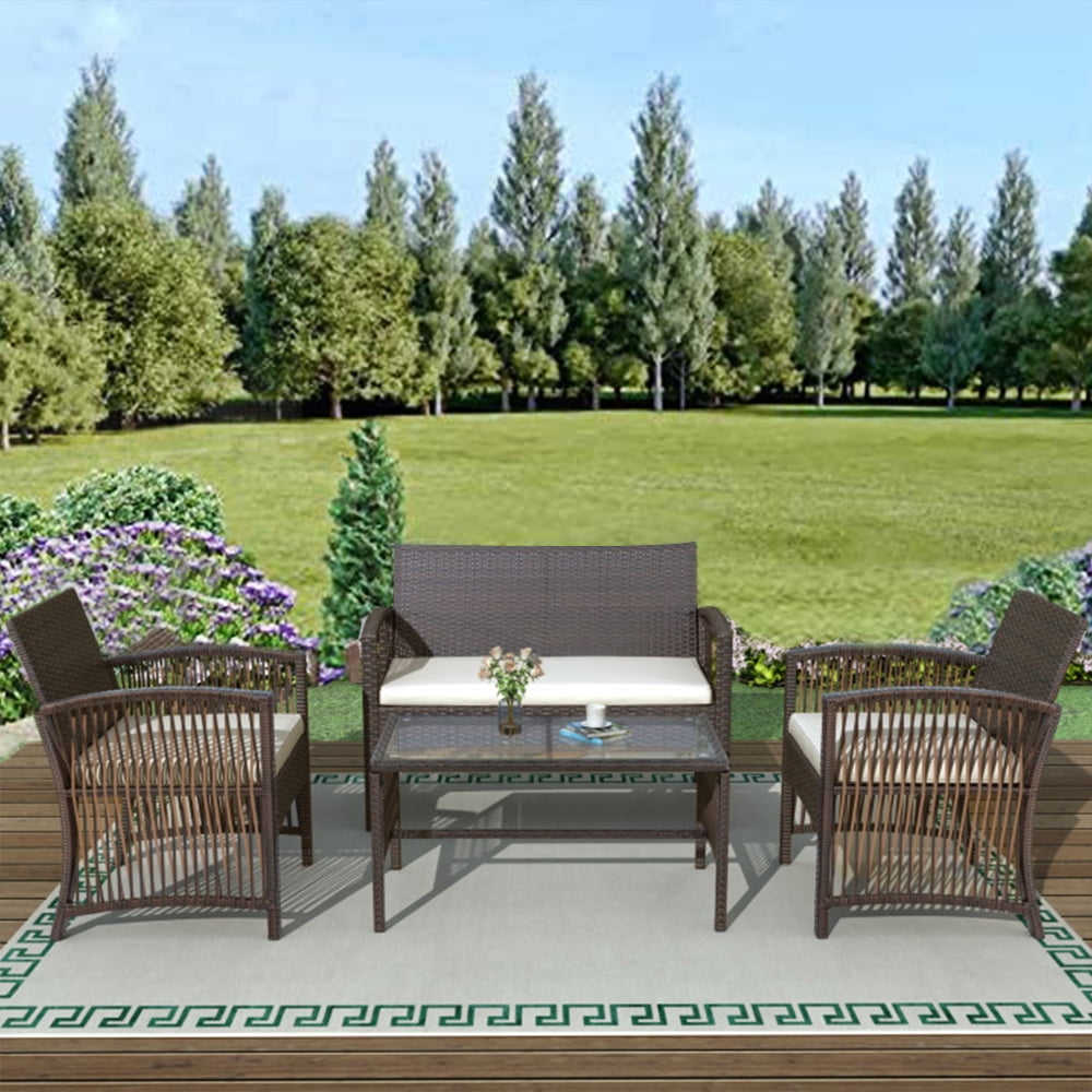 4 Piece Garden Sofa Set. What are the shipping options for patio conversation sets? Outdoor patio furniture set, 4 piece outdoor sectional sofa wicker rattan chair garden sofa couch conversation sets for yard, pool or backyard. The classically designed set features 2 wide and deep armchairs, plus a large 2 seater sofa and a coordinated table with a toughened glass top, giving a sleek, durable finish.