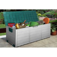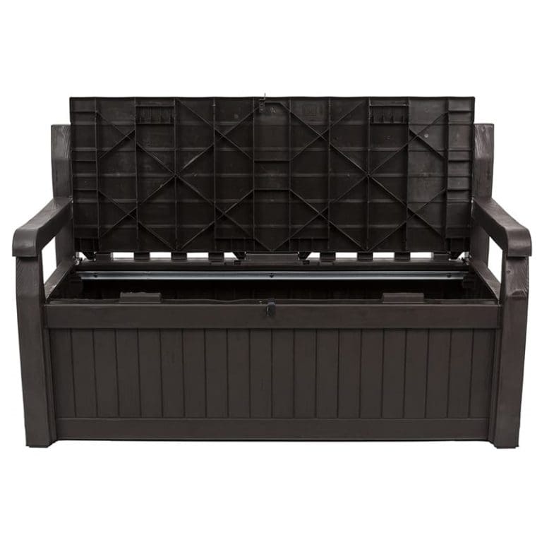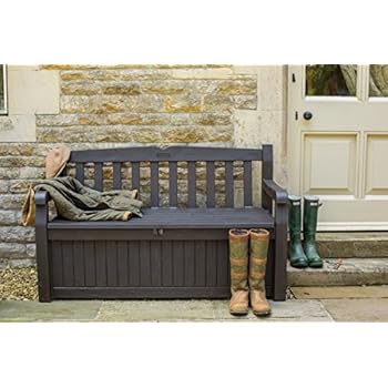 As pretty as it is purposeful, the keter patio storage bench has a gorgeous high backed design that will fit in with even the most beautiful garden while providing comfortable seating for two adults and a storage capacity of 60 gallons. A simple design that is great for storing outdoor items. Height 89cm width132.7cm depth61.2cm 227 ltr.