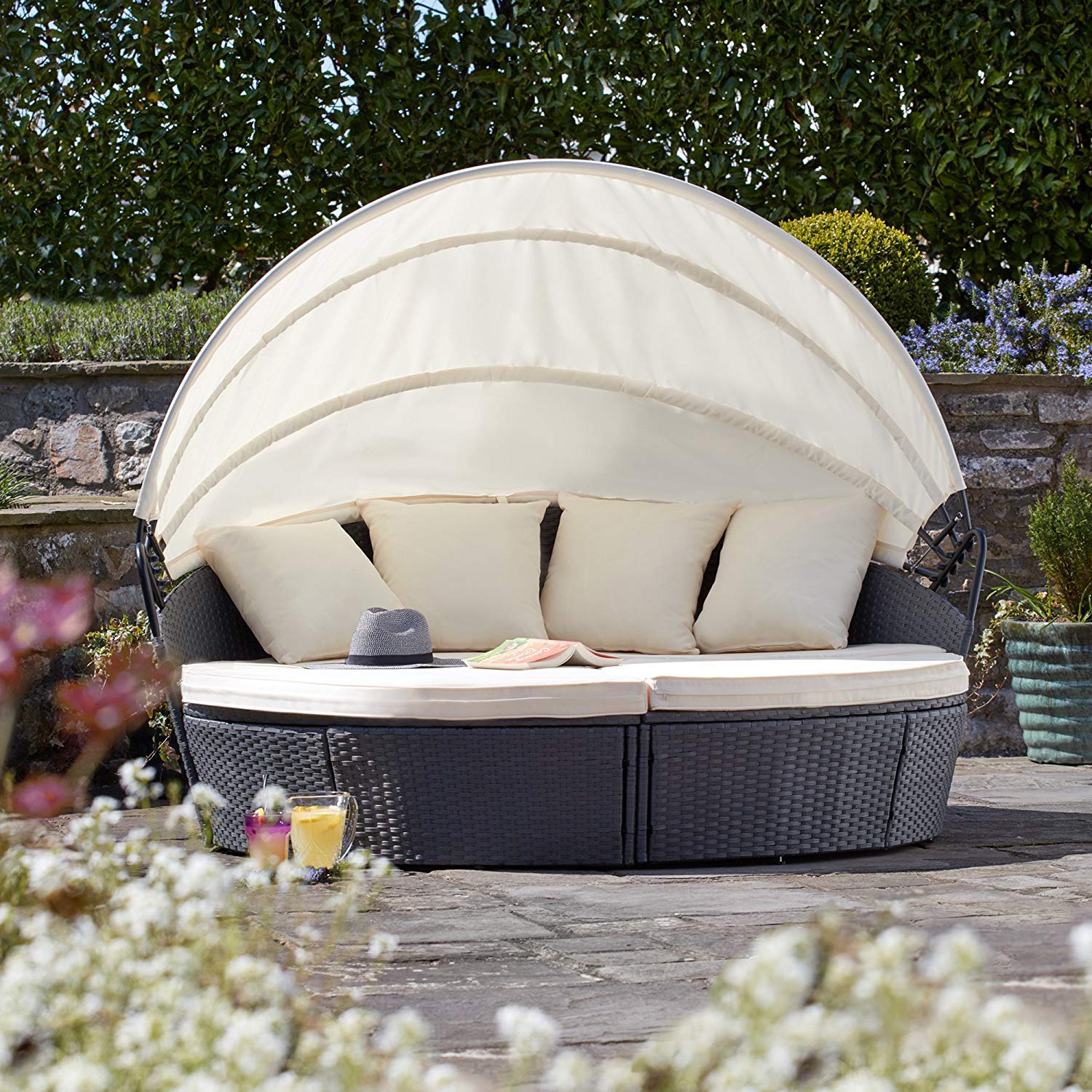 Add rustic charm to your garden with our stylish rattan garden furniture. Garden daybed with canopy are a big hit for summer having the best of all worlds, shade, sun and confort in luxury. Devoko patio furniture outdoor round daybed with retractable canopy wicker rattan separated seating sectional sofa for patio lawn garden backyard porch pool.